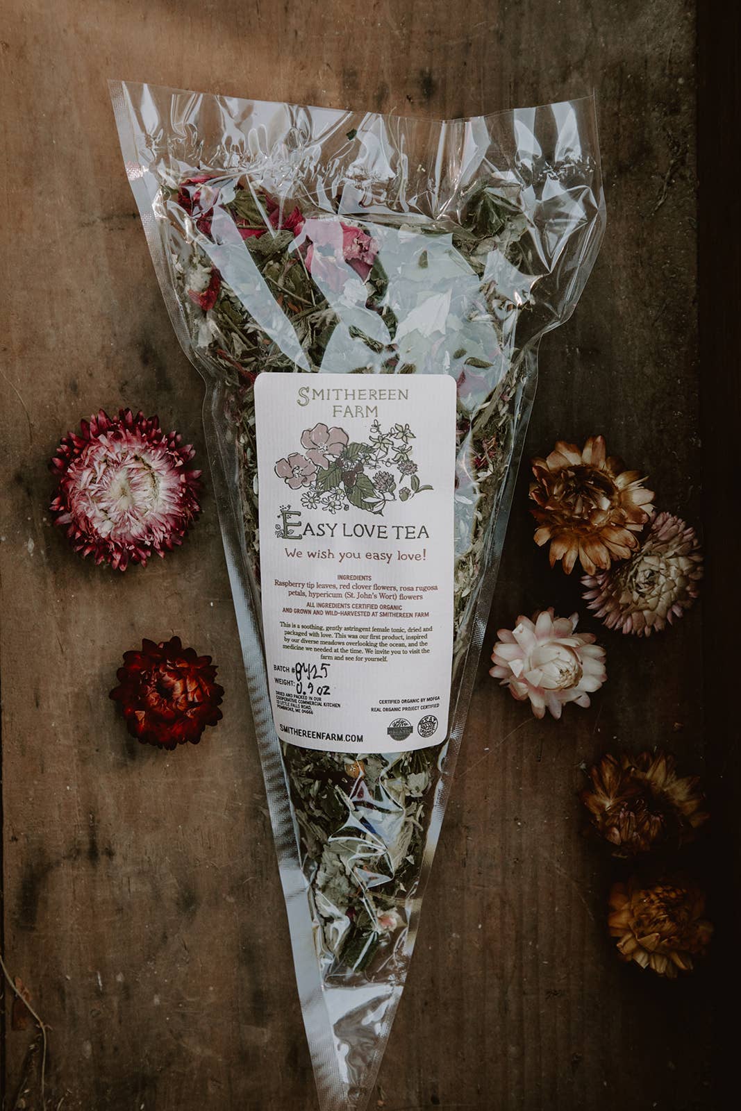 For the heart, the uterus, the elimination and the skin— highly fragrant and beautiful tea, perfect gift for wonderful women. Wildcrafted from the edges of our organic salt water farm this bright, floral herb tea contains herbs known to sooth the heart, tonify the reproductive system and nervous system. Great for women during their moon cycle and before and after giving birth! Ingredients: Organic Wild Red Raspberry Tips, Organic Wild Rosa Rugosa Petals, Organic Wild Red Clover Flowers, Organic Chamomile Flowers, Organic Wild Hypericum Flowers *harvested, dried and packed at Smithereen Farm! Net wt: .9 oz
