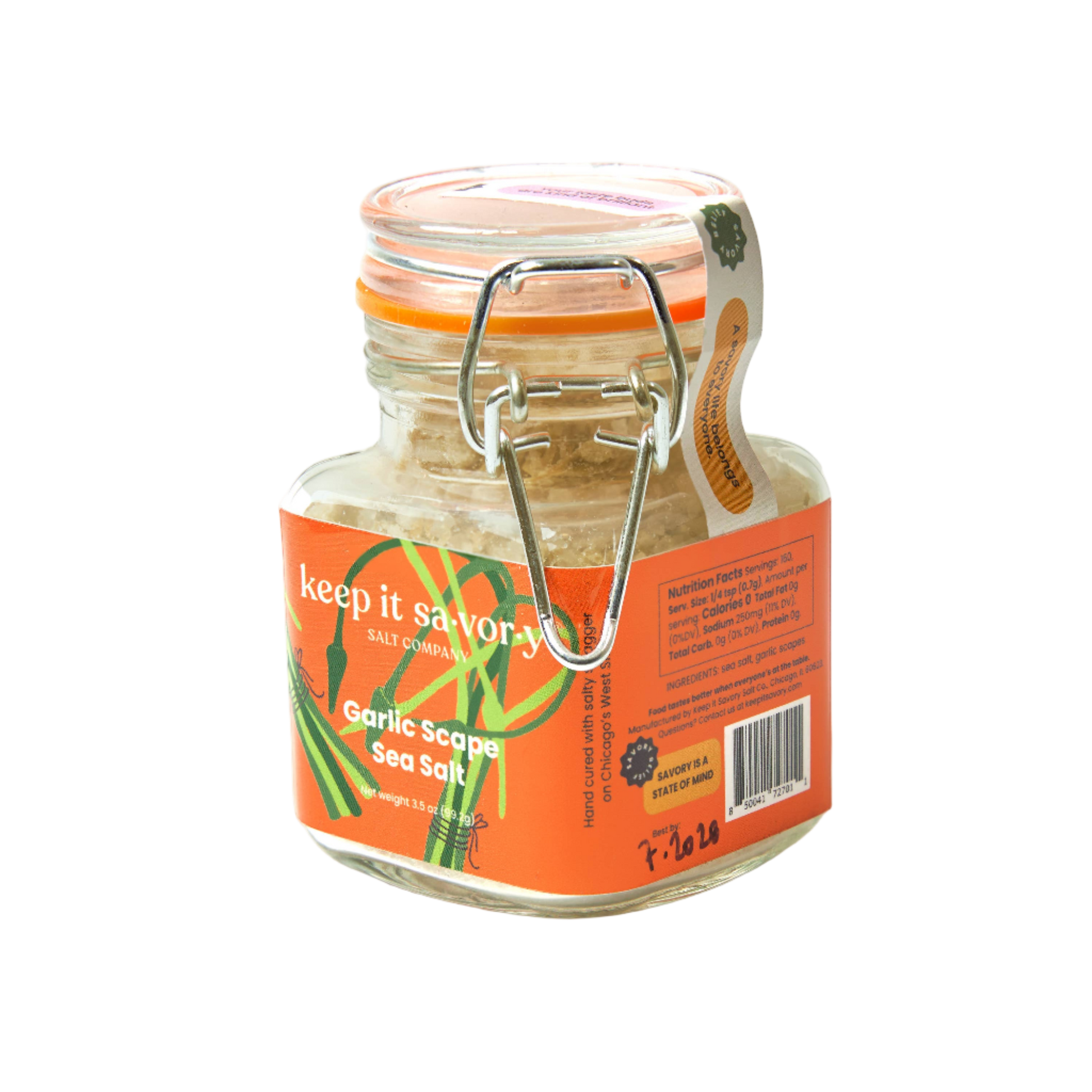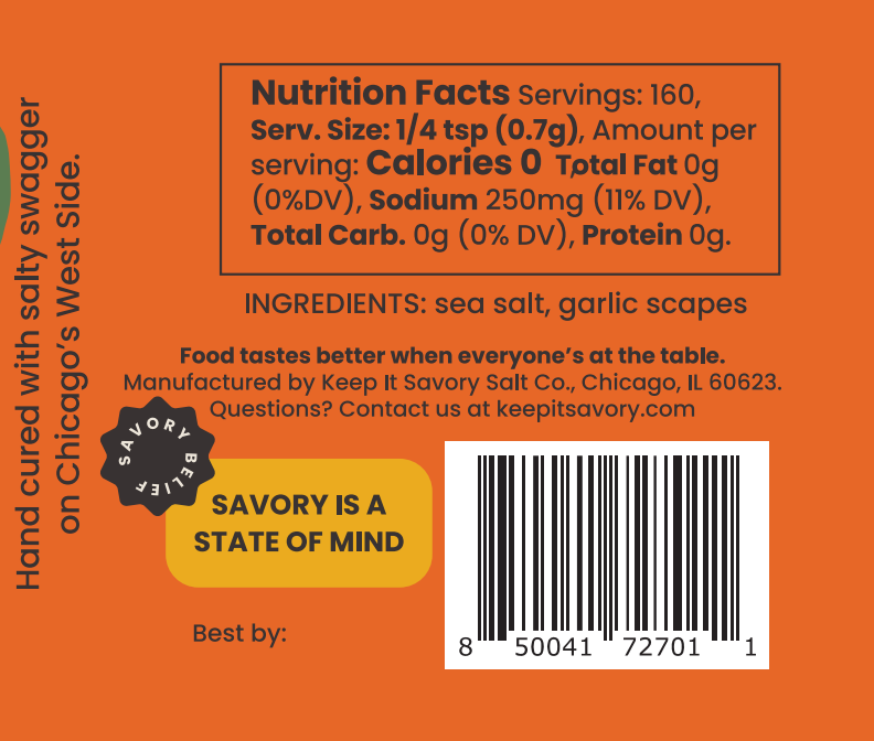 Brace yourself for an explosion of garlicky goodness that will leave your taste buds dancing with delight. Made from highly sought after scapes of the garlic plant, this salt boasts a punchy, green, floral garlic flavor. Chefs and home cooks are going wild for it! This mouthwatering salt will take your dishes from ordinary to extraordinary. We're loving it on grilled steak, eggs, toast with tomatoes, potatoes, rice, and All The Veggies! (And, it's the perfect gift for the culinary wizard in your life.) The scapes were grown with care by youth training at the Windy City Youth Farm just minutes from our production facility. We're here to keep dinner, and our community, SAVORY!