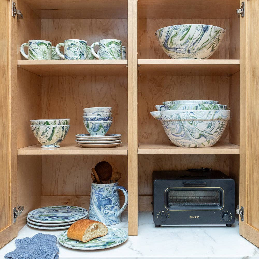 Handcrafted in a Moroccan atelier near Marrakech, this striking set of three mixing bowls showcases the artistry of traditional ceramics. Each bowl is shaped by hand using a distinctive blend of Spanish black and white clays, celebrated for their durability and natural character. The marbled blue green glaze draws inspiration from both Moroccan pottery traditions and global marbling techniques, creating a bold yet harmonious aesthetic. These bowls are perfectly sized for everyday mixing and serving. Because each piece is individually crafted, subtle variations in form and finish are inherent to their beauty, a testament to authentic artisan creation. Led by a master craftsman who teaches the next generation, the atelier preserves centuries of ceramic knowledge in every bowl you bring home.