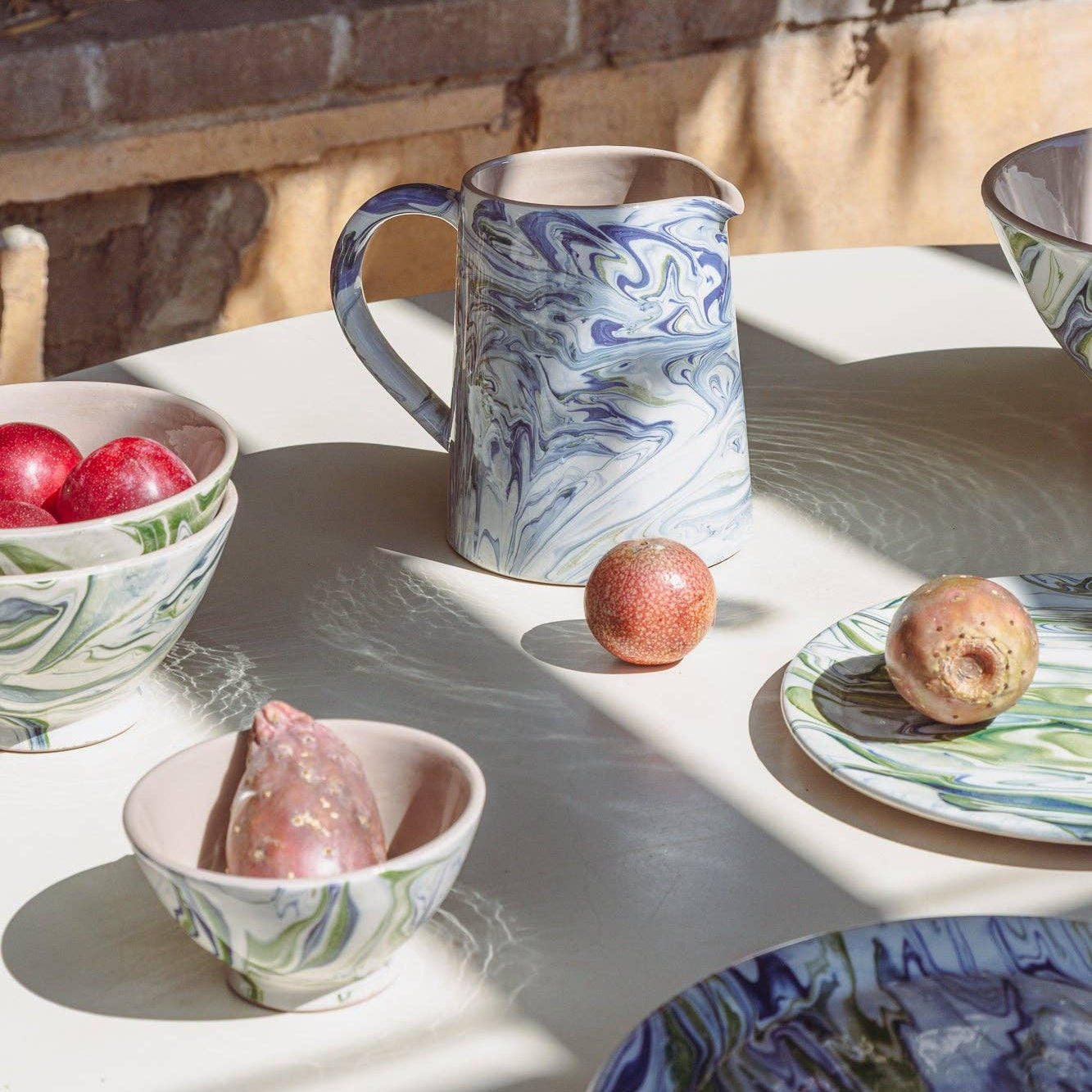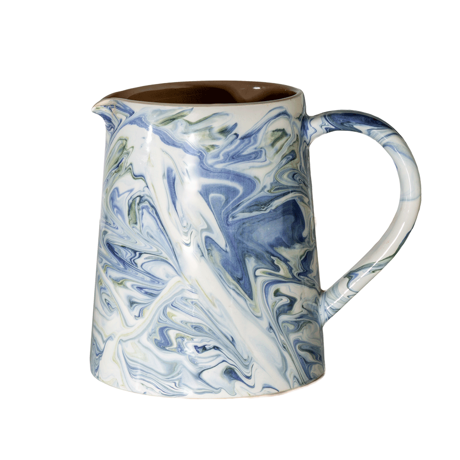 Handcrafted in a Moroccan atelier near Marrakech, this striking pitcher combines traditional artisan techniques with contemporary design. Made from a distinctive blend of Spanish black and white clays, each piece showcases the natural beauty of its materials through subtle variations in form and glaze, hallmarks of authentic handmade work. The Marbled Ocean collection draws inspiration from Moroccan pottery traditions and the timeless art of marbling, resulting in a blue-green palette that captures the essence of natural elements.