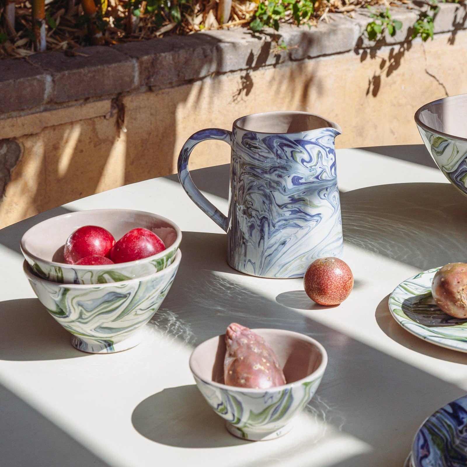 Handcrafted in a Moroccan atelier near Marrakech, this striking bowl showcases the artistry of master ceramicists who blend traditional techniques with contemporary design. Each piece combines Spanish black and white clays, celebrated for their durability and natural character. The distinctive marbled finish draws from both Moroccan pottery heritage and global marbling traditions, creating a captivating blue green palette inspired by natural elements. Because every bowl is shaped and finished by hand, variations in form and glaze are marks of authenticity.