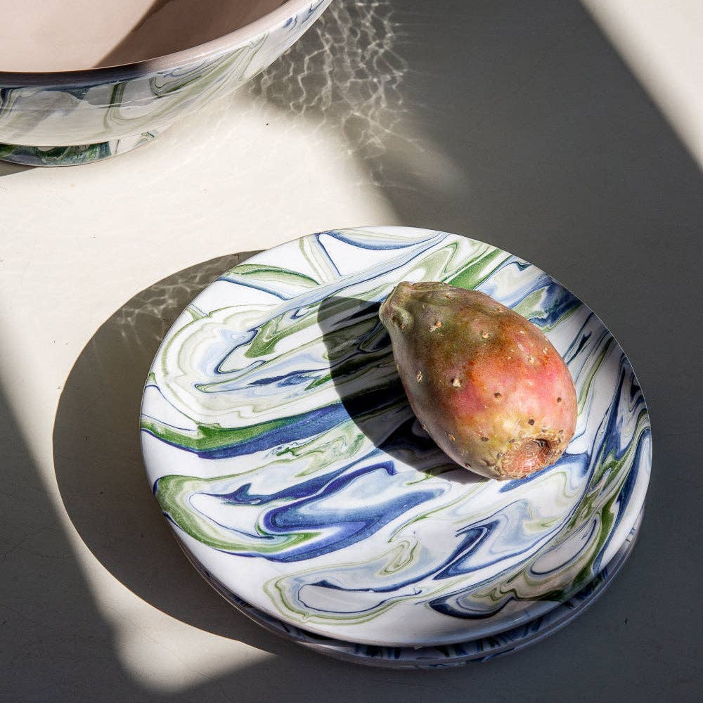 Handcrafted in a Moroccan atelier using traditional techniques, this salad plate showcases the distinctive marbled aesthetic inspired by global pottery traditions. Each piece blends Spanish black and white clays, selected for their durability and natural character. The ocean-inspired blue and green tones create a serene, sophisticated look that complements any table setting. Because these ceramics are shaped and finished entirely by hand, each plate carries its own subtle variations, a testament to authentic artisan craftsmanship. Led by a master ceramicist who teaches the next generation, the atelier honors generations of skill and dedication in every creation.