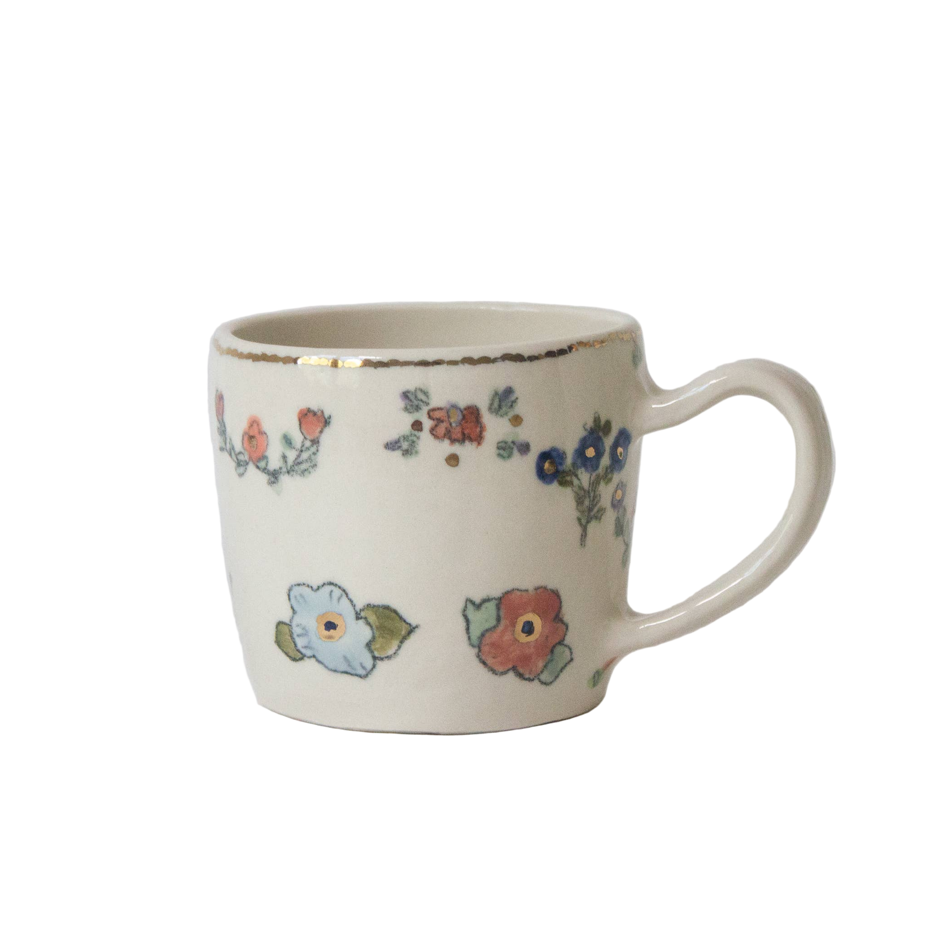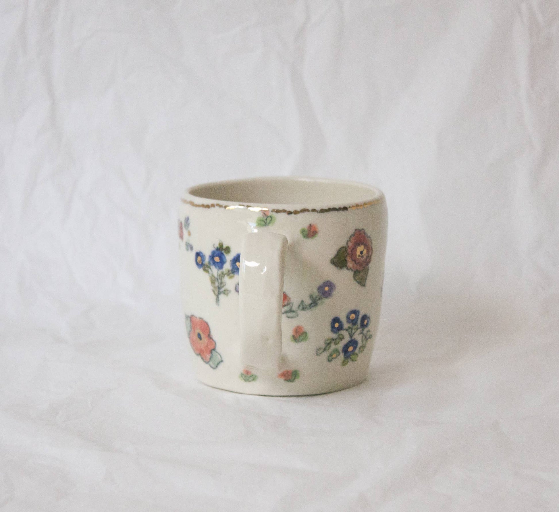 Handmade ceramic mug made thoughtfully with porcelain clay, hand drawn and painted with food safe ceramic materials by the artist in her small studio. One of a kind mugs gives more creative freedom to the artist, and allows shops to be able to offer unique pieces that would not otherwise be able to be wholesaled. Only one can be purchased- add several for a small (or large) unique Erika Christine Ceramics collection. Porcelain, underglaze pencil, underglaze, glaze, gold luster Measurements Height: approx 3.5" Width: approx 3.25" Can hold approx. 12 ounces of liquid Dishwasher safe, handwashing recommended NOT microwave safe due to gold luster.