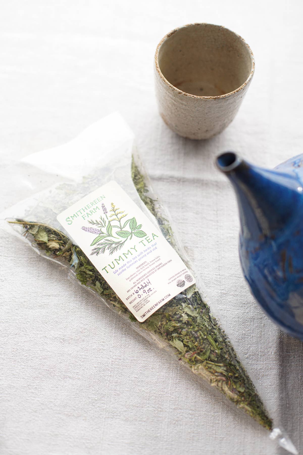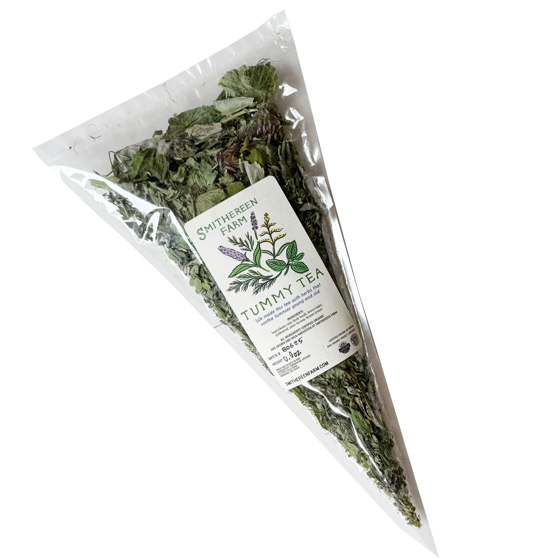 We made this tea with herbs that soothe tummies young and old. Ingredients: lemon balm, anise hyssop, tulsi (Holy Basil), fennel fronds, goldenrod All ingredients are certified organic! Grown and wild-harvested at Smithereen Farm! Net weight: .9 oz